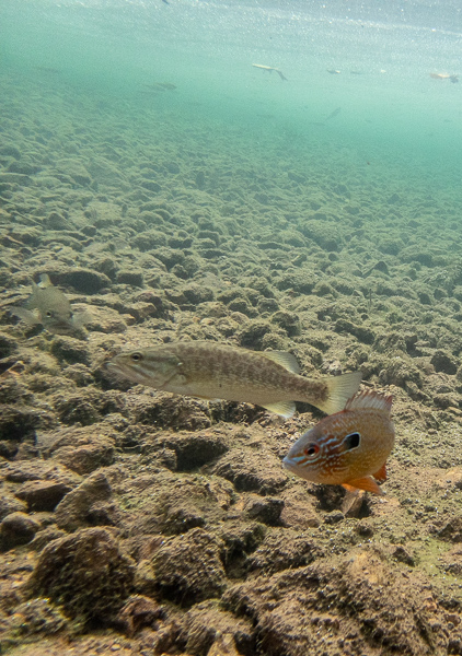 The dog and I cool off in a small shallow pool between two bony riffles, watching bass and minnows, darters, crayfish. Tiny little sunfish, longears probably, mill around cobble with flag-finned baby smallmouth. Adults move up in spring, spawn, leave their babies in shallow headwaters to avoid the temptation of eating their own. Prairies and forests donate their own aquatic organisms, making the stream more diverse than either of its parents. Some of the species from the prairie have already blinked out further west, from Kansas and Oklahoma, Nebraska and eastern Colorado, as water is pumped for corn and for cows. They’ll be alright here, in this stream, for now.