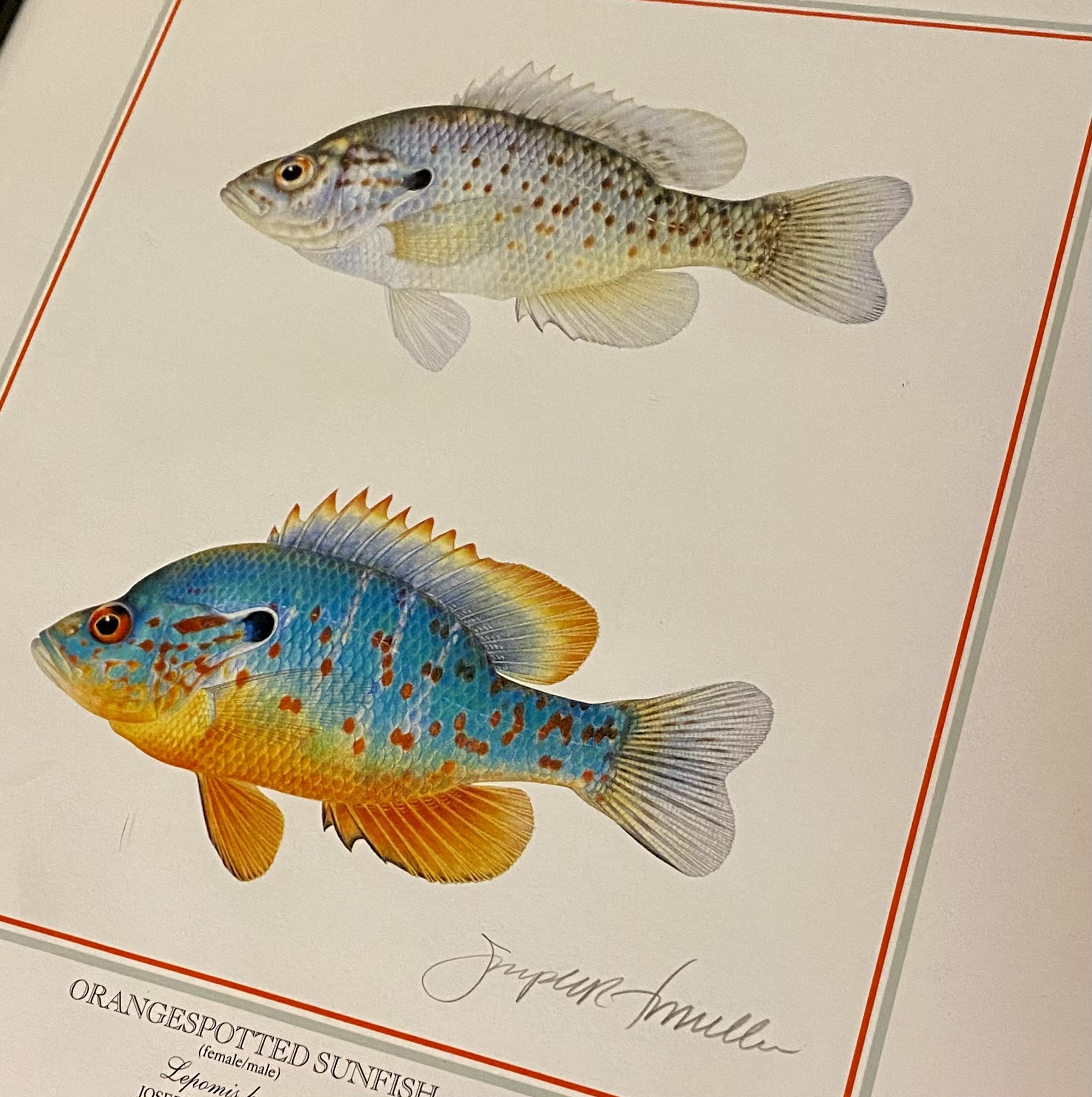 A couple inches of snow on the ground and a couple prints, back from the frame shop, ready to hang in the home office. First up, a pair of orangespotted sunfish. One of my first summer jobs was surveying sand-bottom prairie streams, where these guys hang out in slow pools and weedy backwaters. They typically only get two or three inches long, and in the summer males dimple shallow waters with the nests they guard. Several different minnow species spawn over these nests, tended and defended by male orangespots.